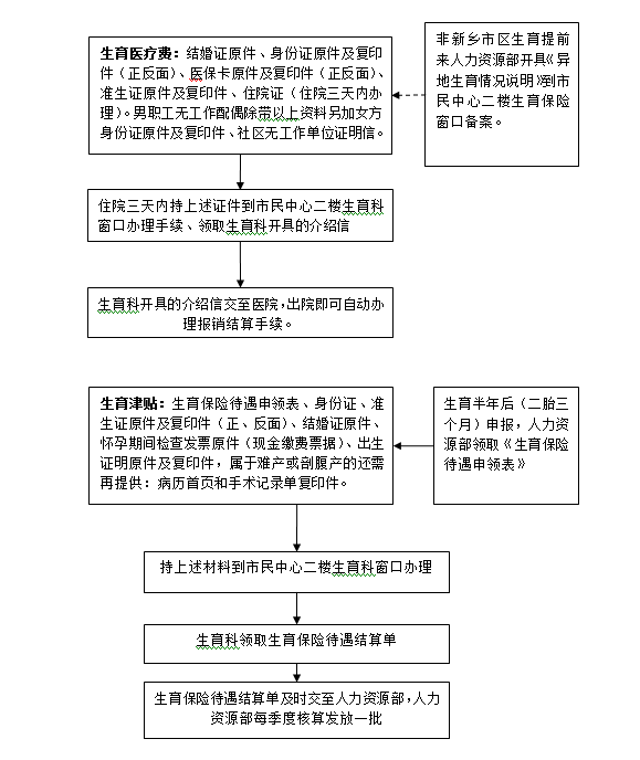 ![]() 1 .办理生育医疗费需带资料:结婚证原件、身份证原件及复印件(正反面)、医保卡原件及复印件(正反面)、准生证原件及复印件、住院证(住院三天内办理)。男职工无工作配偶除带以上资料另加女方身份证原件及复印件、社区无工作单位证明信。注意:非新乡市区生育请提前来人力资源部开具介绍信《异地生育情况说明》到市民中心二楼生育保险窗口备案。 2.办理生育津贴需带资料:人力资源部领取生育保险待遇申领表、身份证、准生证原件及复印件(正、反面)、结婚证原件、怀孕期间检查发票原件(现金缴费票据)、出生证明原件及复印件,属于难产或剖腹产的还需再提供:病历首页和手术记录单复印件。 3.办理上环、取环需带资料:单位介绍信、医保卡原件及复印件、取环者需提供医院证明。(办完手续三天内到医院就诊) 4.人工流产需带资料:单位介绍信、医保卡原件及复印件、上环证明或孕检手册(办完手续三天内到医院就诊) 5.定点医院:中心医院、第一人民医院、第二人民医院、妇幼保健院、三七一医院、新华医院、新机医院 6.2013年5月21日以后,取消《新乡市社会医疗工伤生育保险手册》(门诊重症慢性病患者除外),新乡市城镇职工医疗工伤生育保险参保人员看病时必须使用社会保障卡“持卡就医”,不用再带医保手册。 电话3060239 |