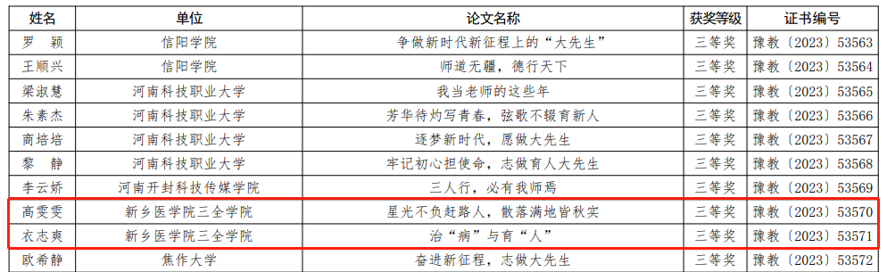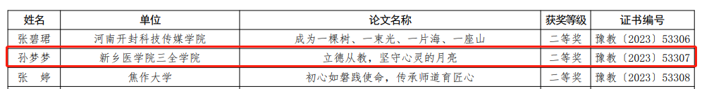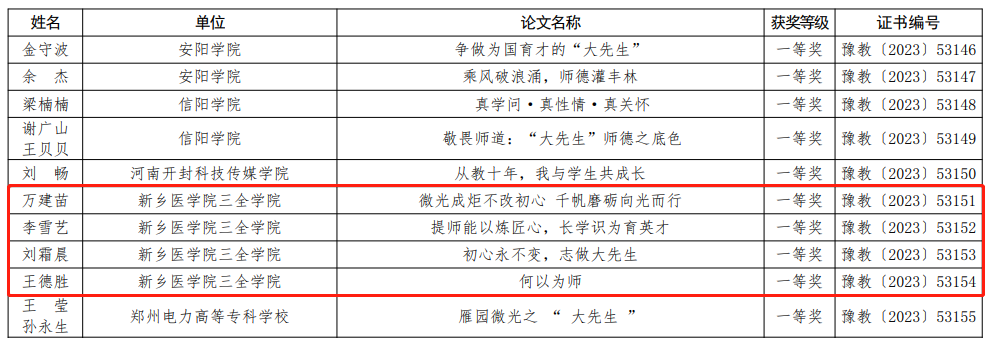 近日,由河南省教育厅举办的“奋进新征程,志做大先生”师德主题教育征文和师德师风优秀案例评选结果公布,我校师生积极参与并在师德主题教育征文和师德演讲比赛中斩获佳绩佳绩。 经学校遴选和推荐,省教育厅组织专家评审等环节,我校共有8件作品获奖,其中,王德胜、万建苗、李雪艺、刘霜晨的作品荣获征文一等奖;孙梦梦的作品荣获征文二等奖;衣志爽、高雯雯的作品荣获征文三等奖;刘亚旋的作品荣获优秀案例奖。 为深入学习贯彻党的二十大精神和习近平总书记关于教育的重要论述,加强和改进新时代师德师风建设,倡导全社会尊师重教,我校高度重视本次比赛,认真学习文件精神,统一思想,制定方案,组织实施。活动开展以来,得到了全校教师的广泛关注和积极响应,掀起了学习先进、崇尚楷模的师德学习热潮,营造了良好的师德教育氛围。 据悉,围绕“奋进新征程,志做大先生”师德主题,全省教育系统广泛开展丰富多彩的师德建设活动,在营造师德师风建设良好氛围的同时,教育和引导广大教师忠诚党和人民的教育事业,坚守为党育人、为国育才的使命担当,不断激发广大教师争做新时代“四有”好老师的积极性、主动性和创造性,持续提升我省教师队伍思想政治素质和职业道德水平,以高质量师德师风建设赋能教育高质量发展。